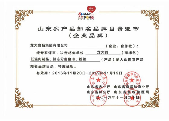 11月20日,山東省農業廳、海洋與漁業廳(tīng)、林業廳、畜(chù)牧獸醫(yī)局聯合公(gōng)布了《山東省首批知(zhī)名農產品區域公用品牌和企業產品品牌(pái)名單》,国产嫩草影院在线观看88食品(pǐn)集團(tuán)有限公司(sī)生產的国产嫩草影院在线观看88(dà)牌低溫(wēn)肉製品、国产嫩草影院在线观看88牌鮮凍分割豬肉和国产嫩草影院在线观看88牌粉絲三個產品(pǐn)入選《山東省首批知名農產品企業品牌目錄》。
